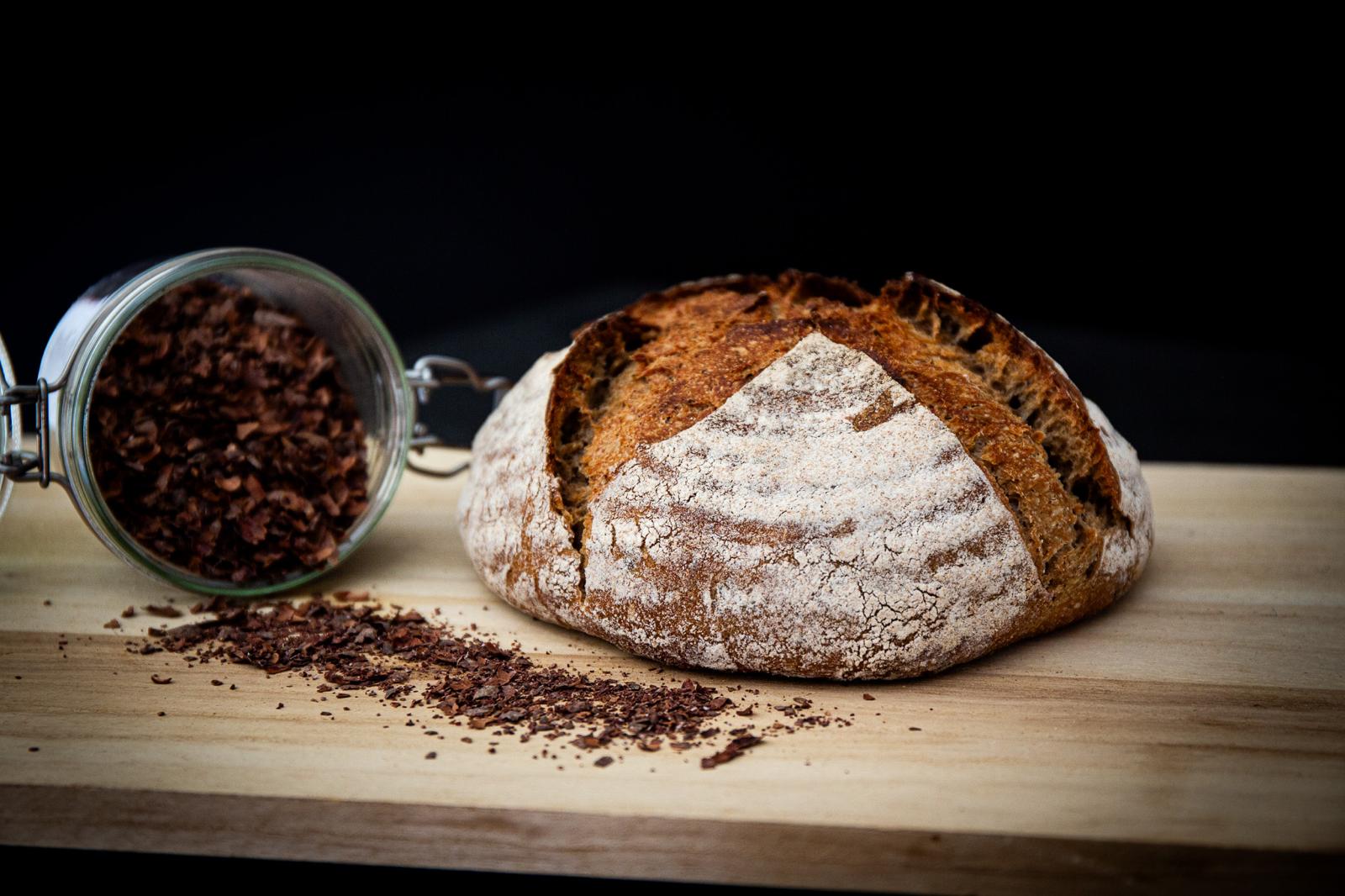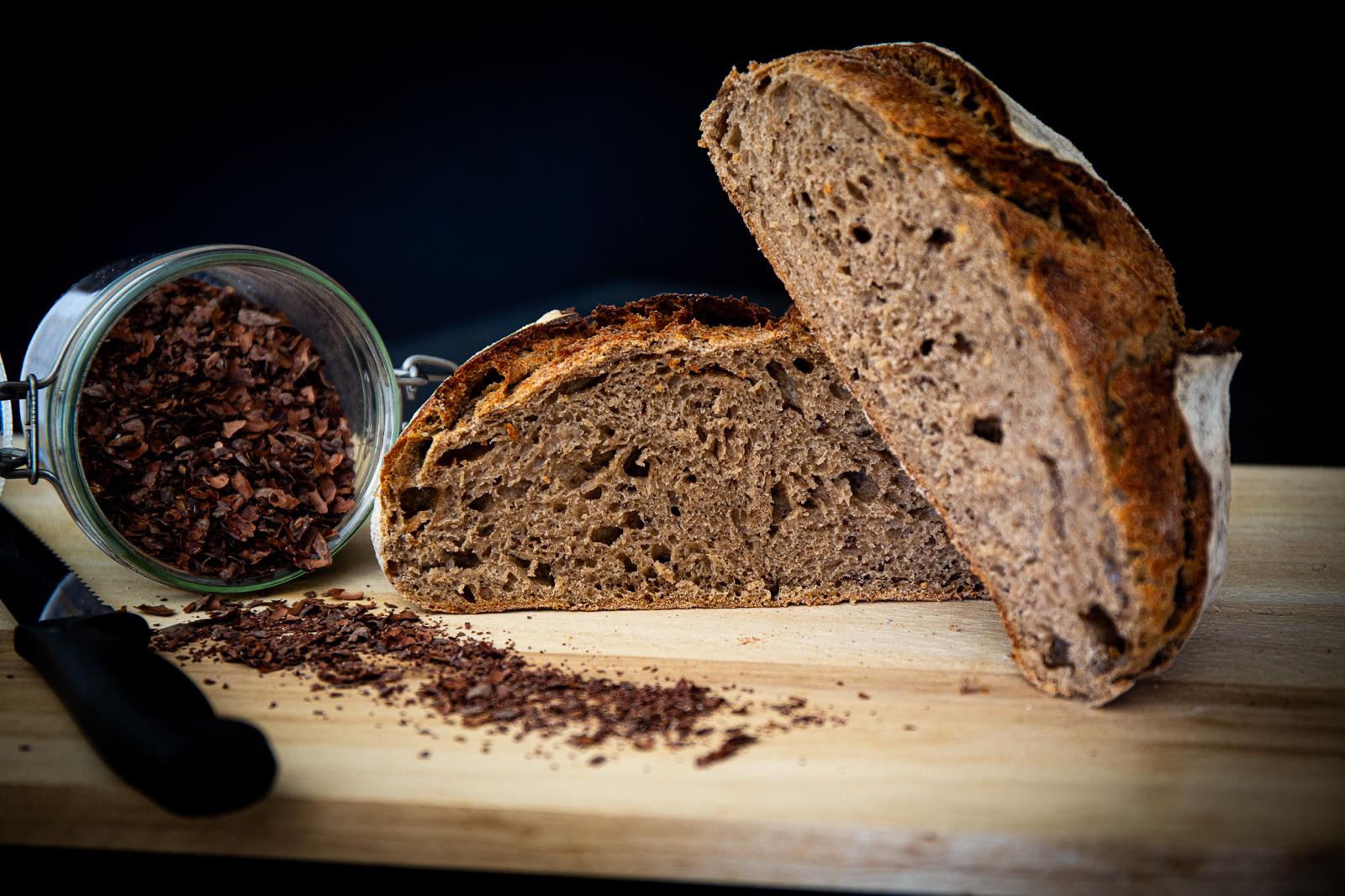 Ce pain est élaboré à partir de farines de seigle, d’épeautre et de froment, toutes moulues sur nos meules. Il est enrichi de cosses de fèves de cacao et de leur infusion, intégrées directement à la pâte.